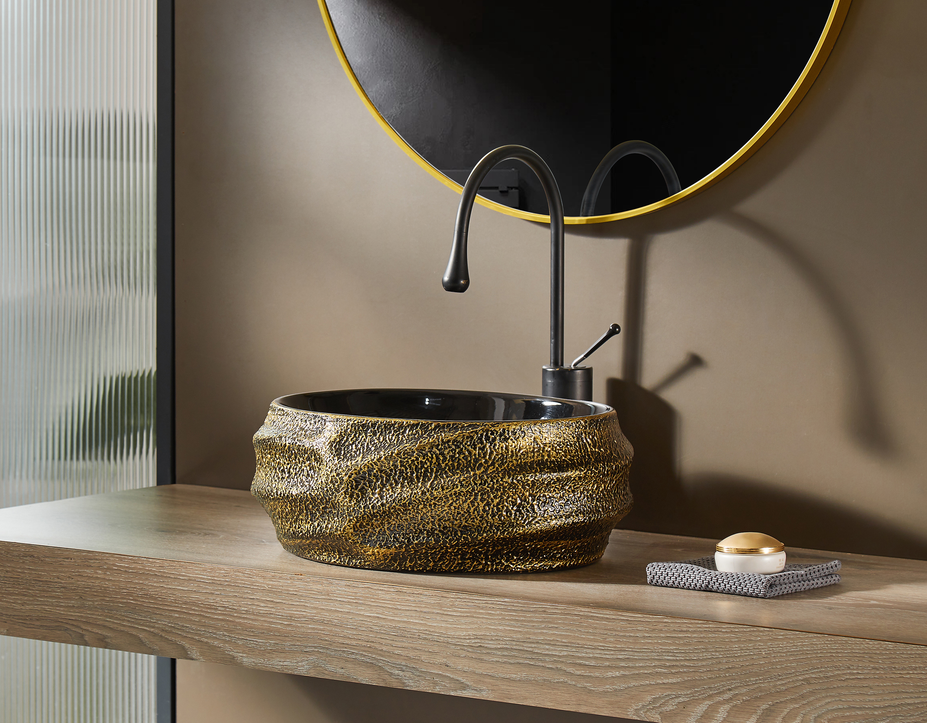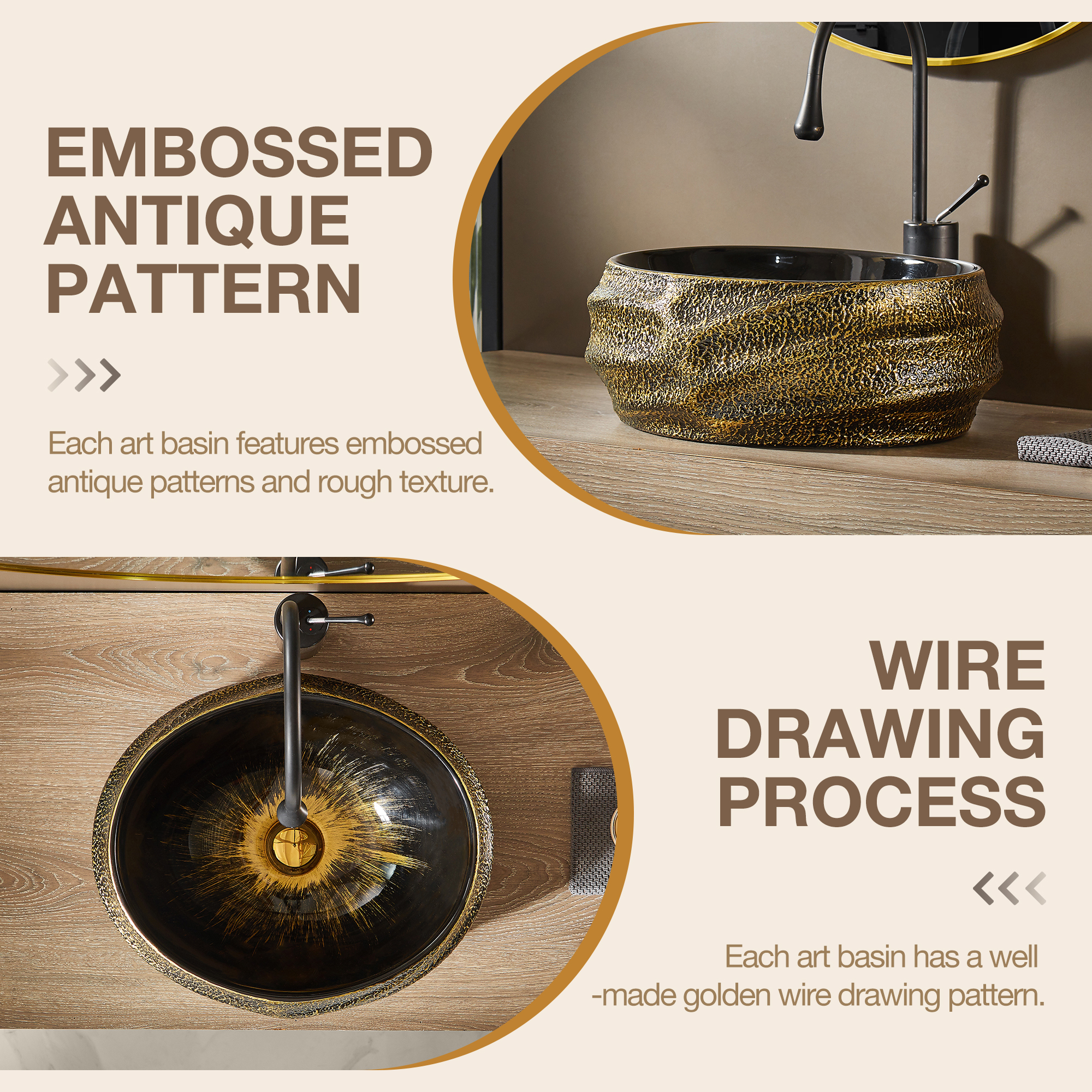The vintage gold art basin boasts a large capacity for your convenience.This Innovative design can effectively prevent water splashing out, making cleaning a breeze. |