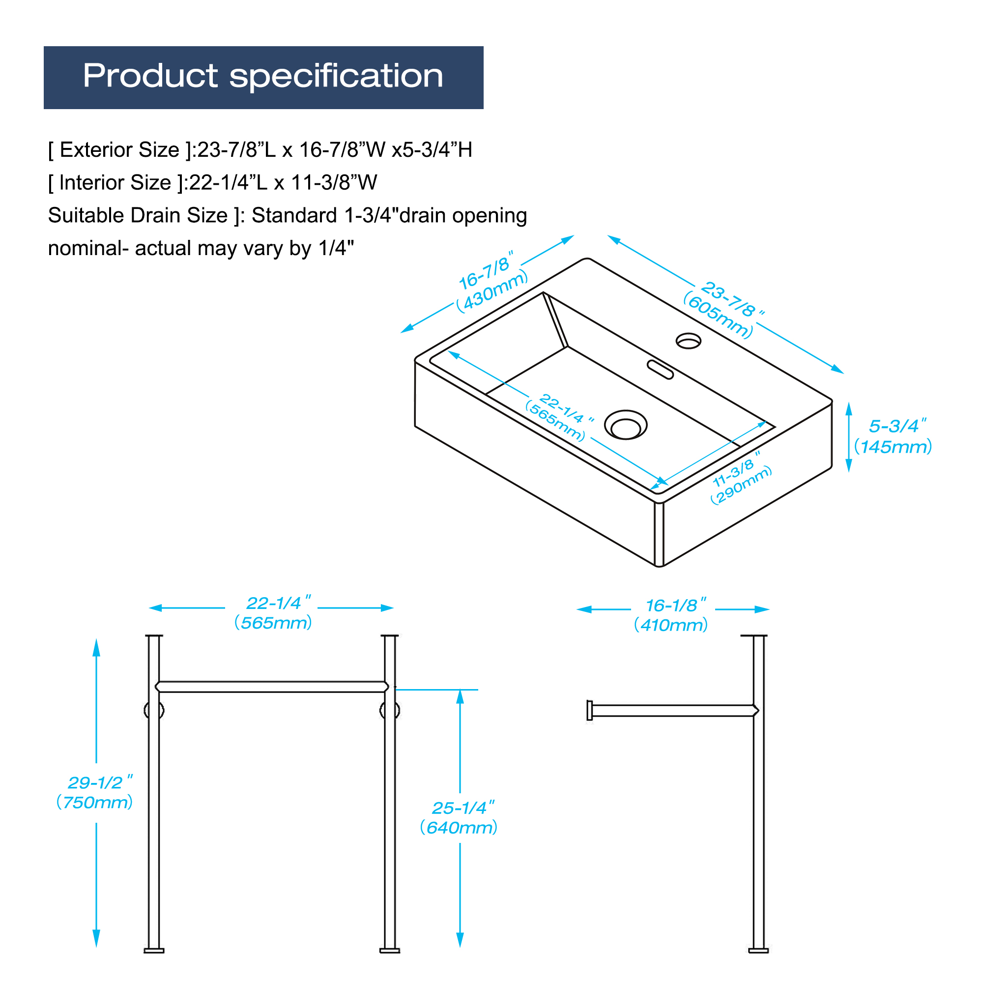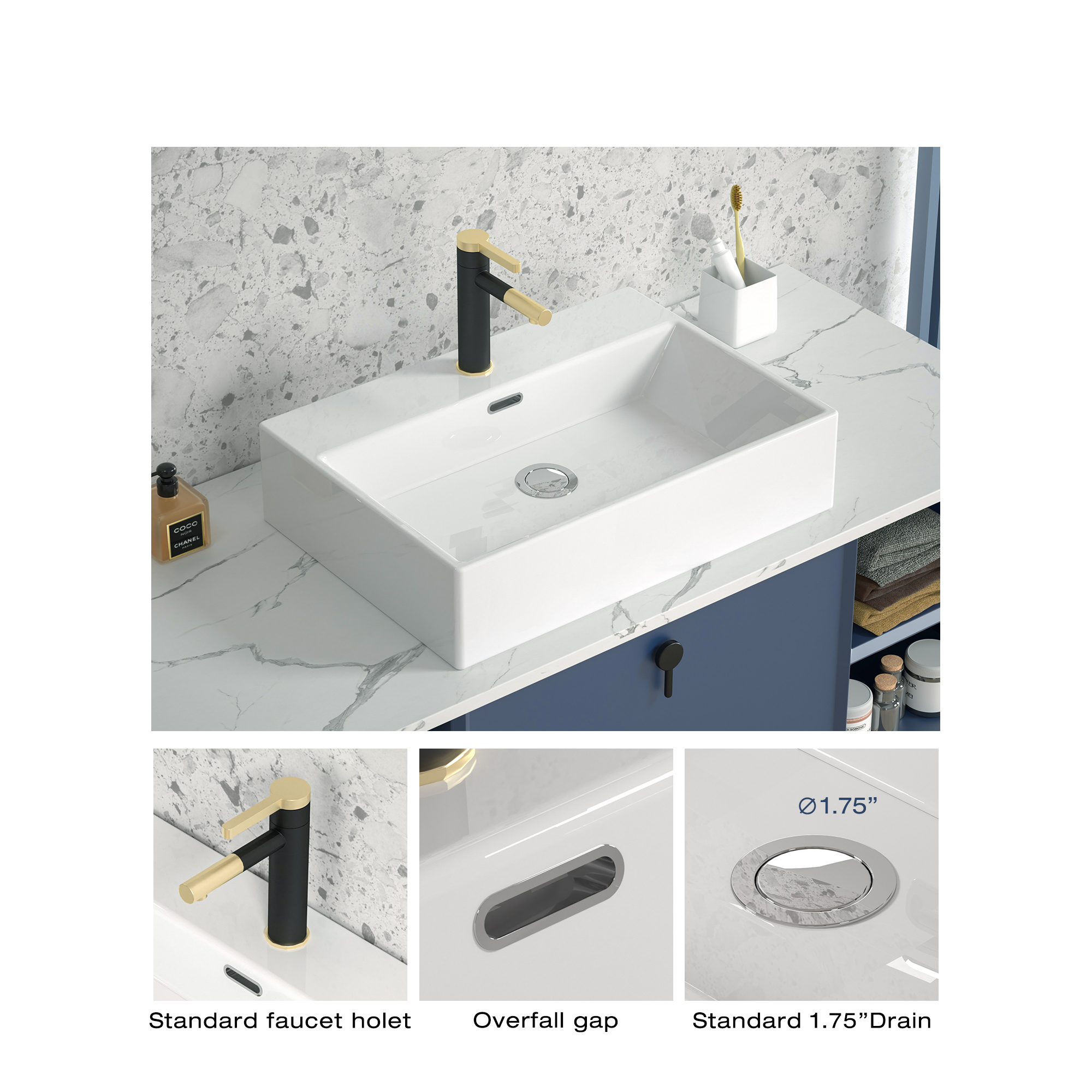 | Premium QualityPremium quality ceramic construction, smooth and polished surface. Resistant to stains and the thickened edges make it more durable. | Fast DrainStandard 1-3/4" drain opening , fast drain and prevent blockage. The sloped inner surface drains quickly without accumulating water stains. |