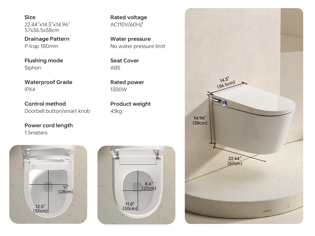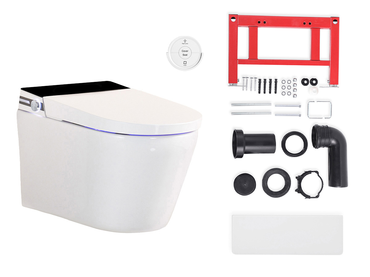 【 Basic Smart Wall Hung Toilet Combo 】: MEJE create New Wall Hung Toilet Series -- the toilet comes with a large capacity Built-In Water Tank and a concealed In-Wall Carrier, easy installtion. It features Basic Intelligent Functions : Adjustable Seat Temp, Auto Flush, Foot Sensing Flush, Night Light, plus a Flush Remote Control.