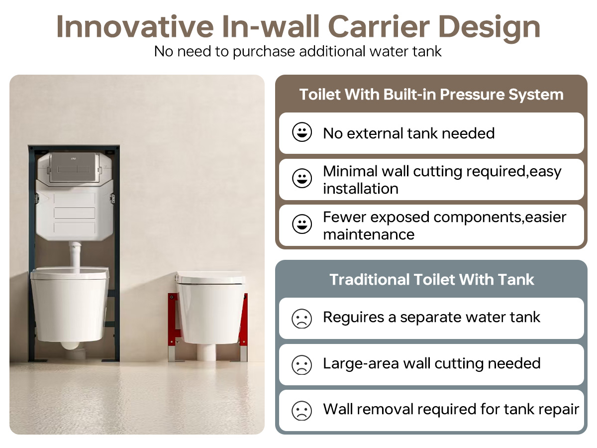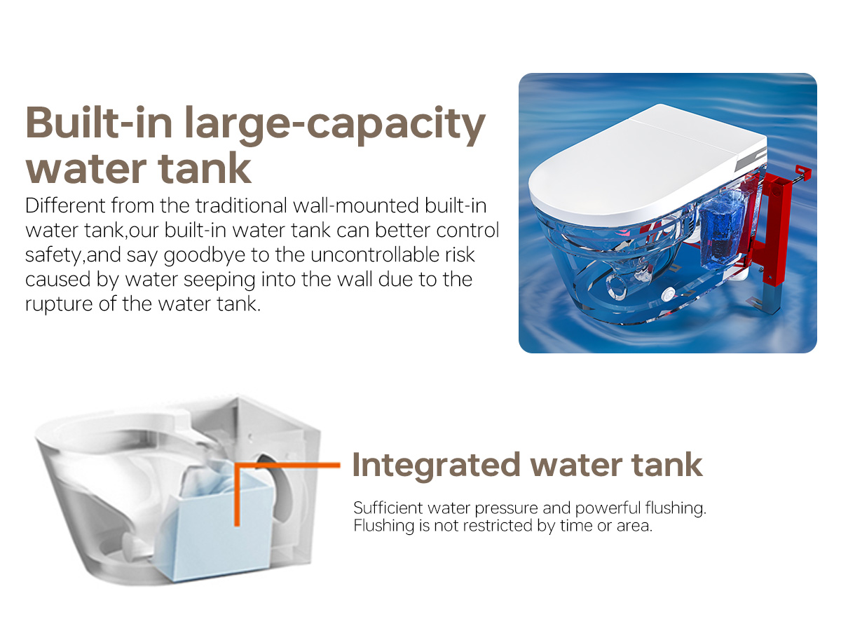 【No need for an additional water tank】: Our wall mounted smart toilet comes with a large capacity Built-In Water Tank and a In-Wall Carrier, so there is No Need to purchase an additional In-Wall Water Tank.
