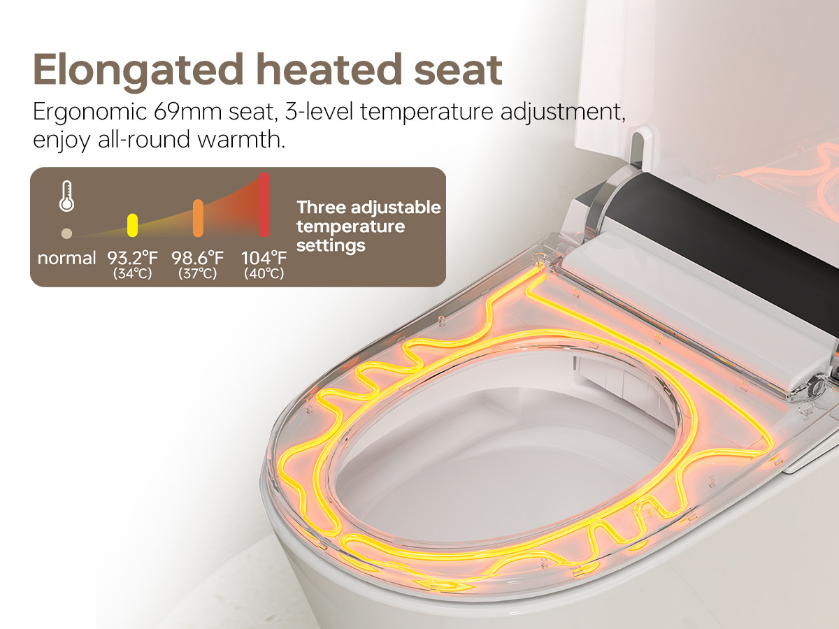【 Heated Seats 】: Elongated heating seat with 4 adjustable temperature settings, which can adjust the temperature according to needs. It eliminates the impact of sitting on a cold toilet seat and provides a comfortable feeling in cold weather.elongated.
