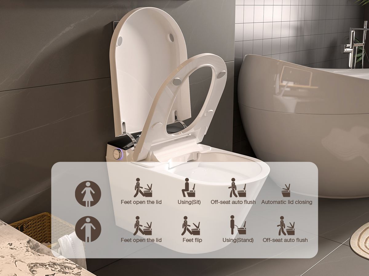 When user approaches, the lid will open automatically; When the toilet lid is open, touch the sensing area with your foot to open the seat; When both the toilet lid and the seat ring are open, touch the sensing area with your foot to launch a flush; After leaving, the lid will close automatically.