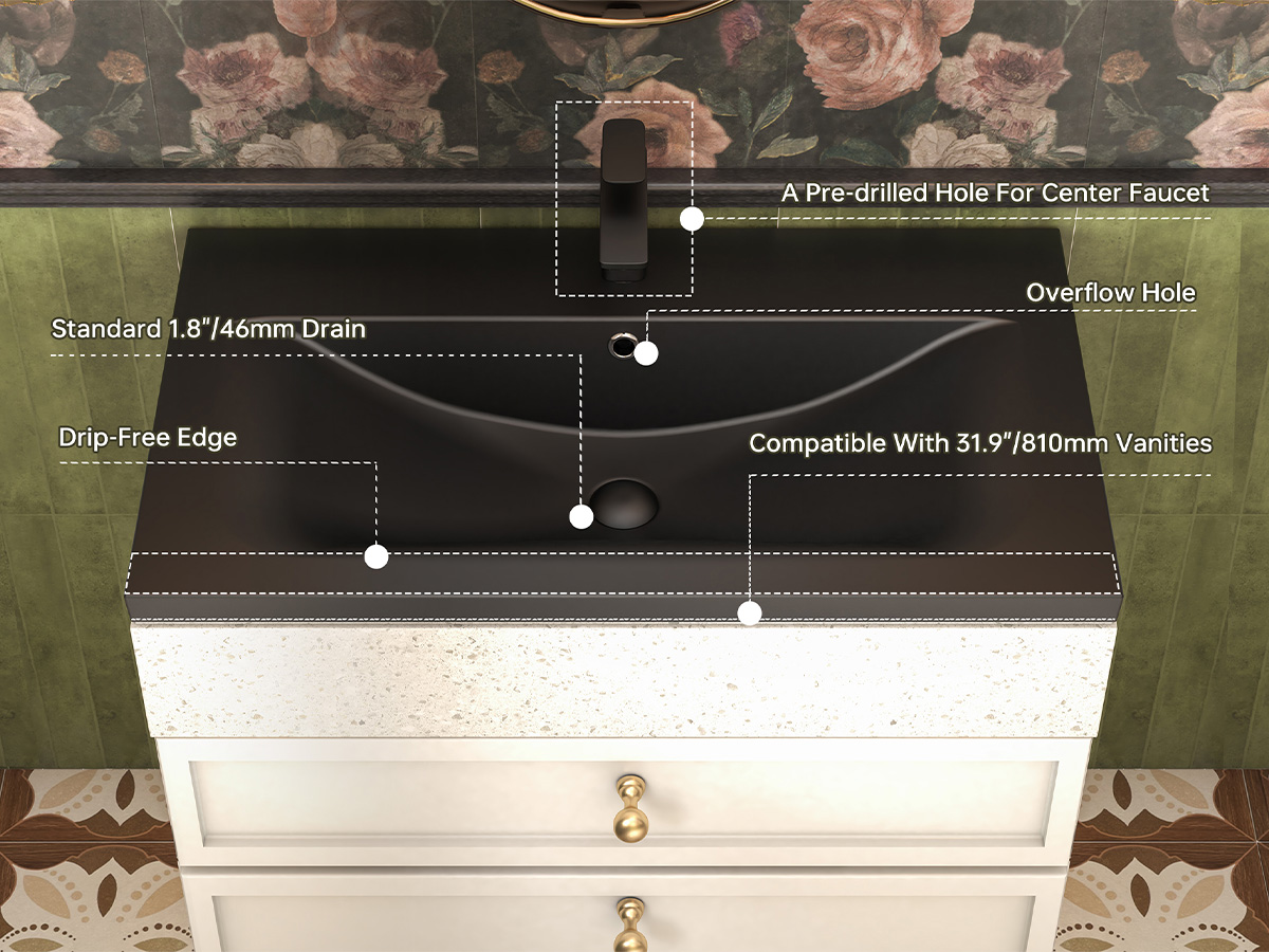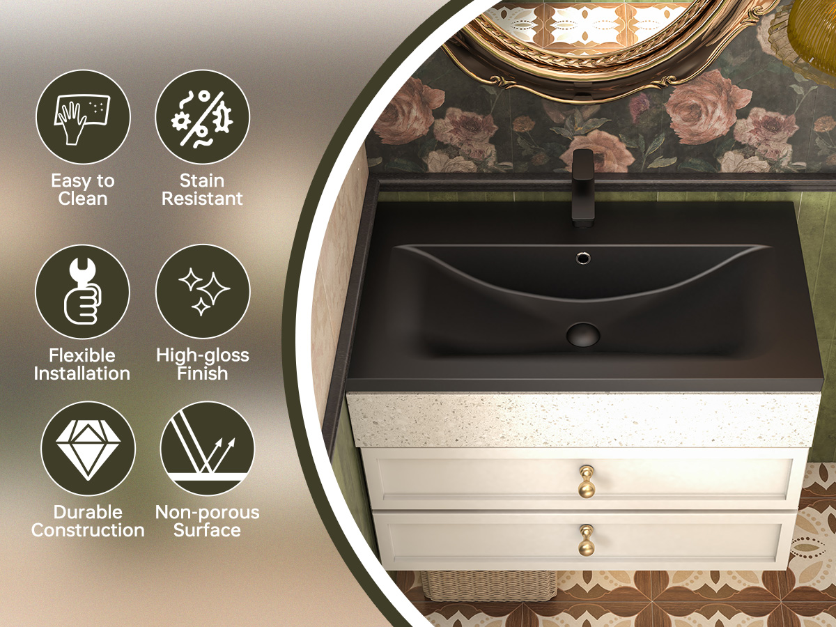 This vanity top sink with glazed surfaces offer a sleek, glossy finish that's durable, easy to clean, and resistant to stains and scratches