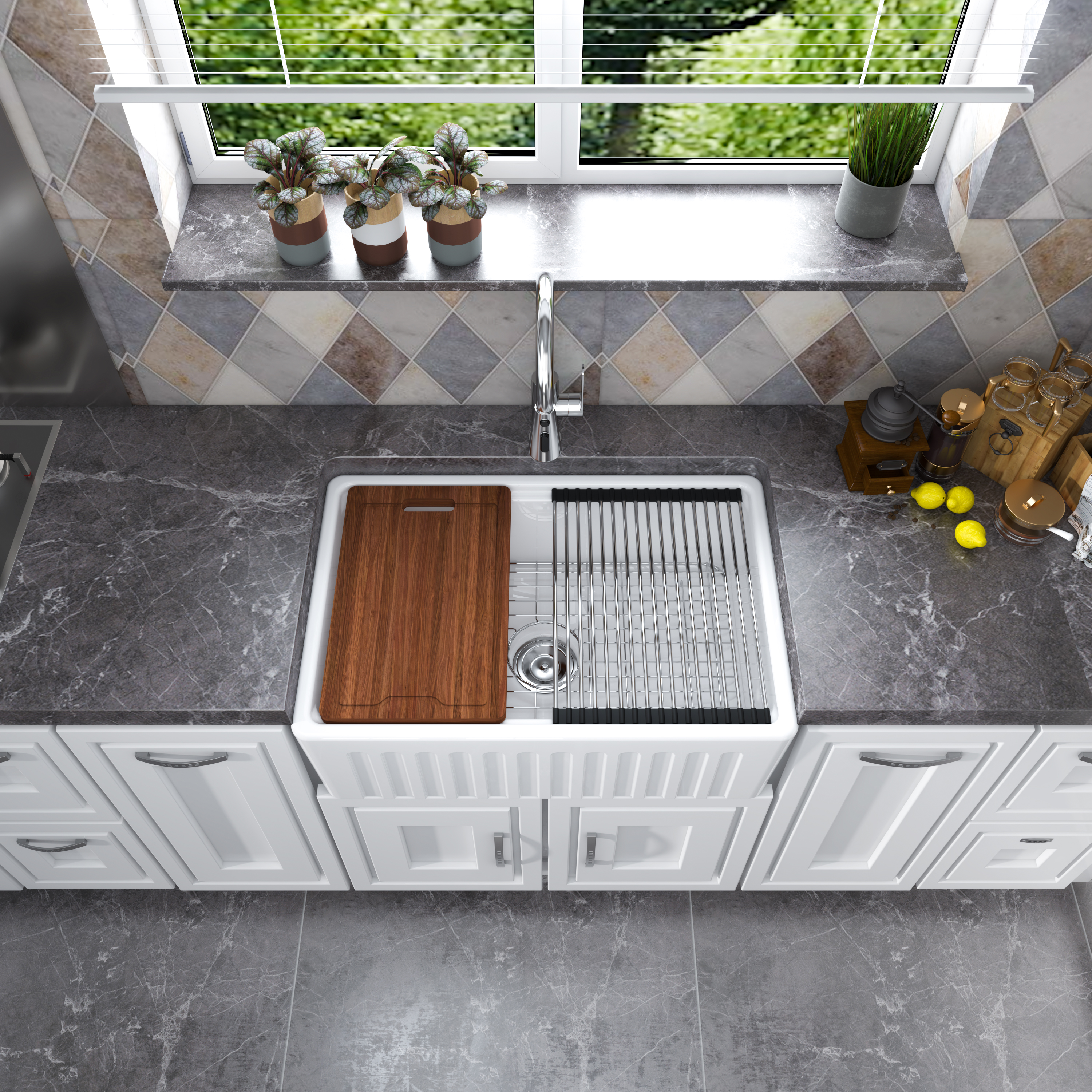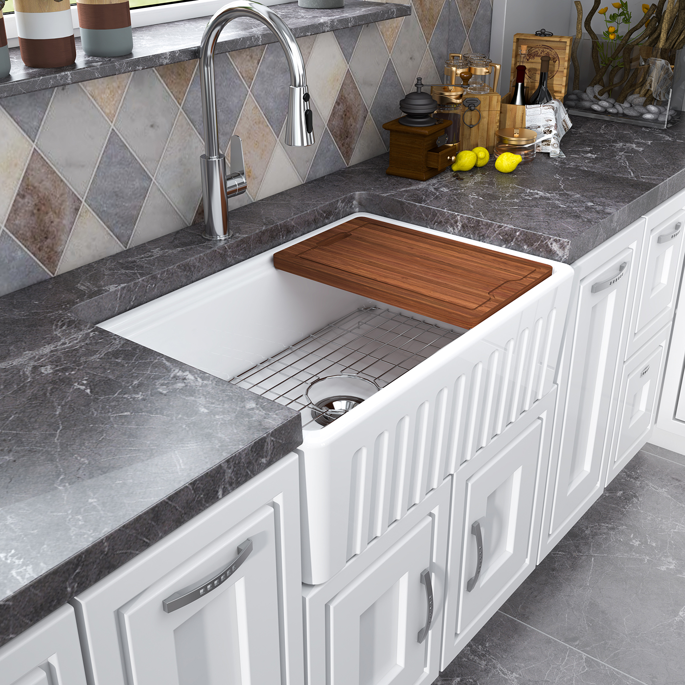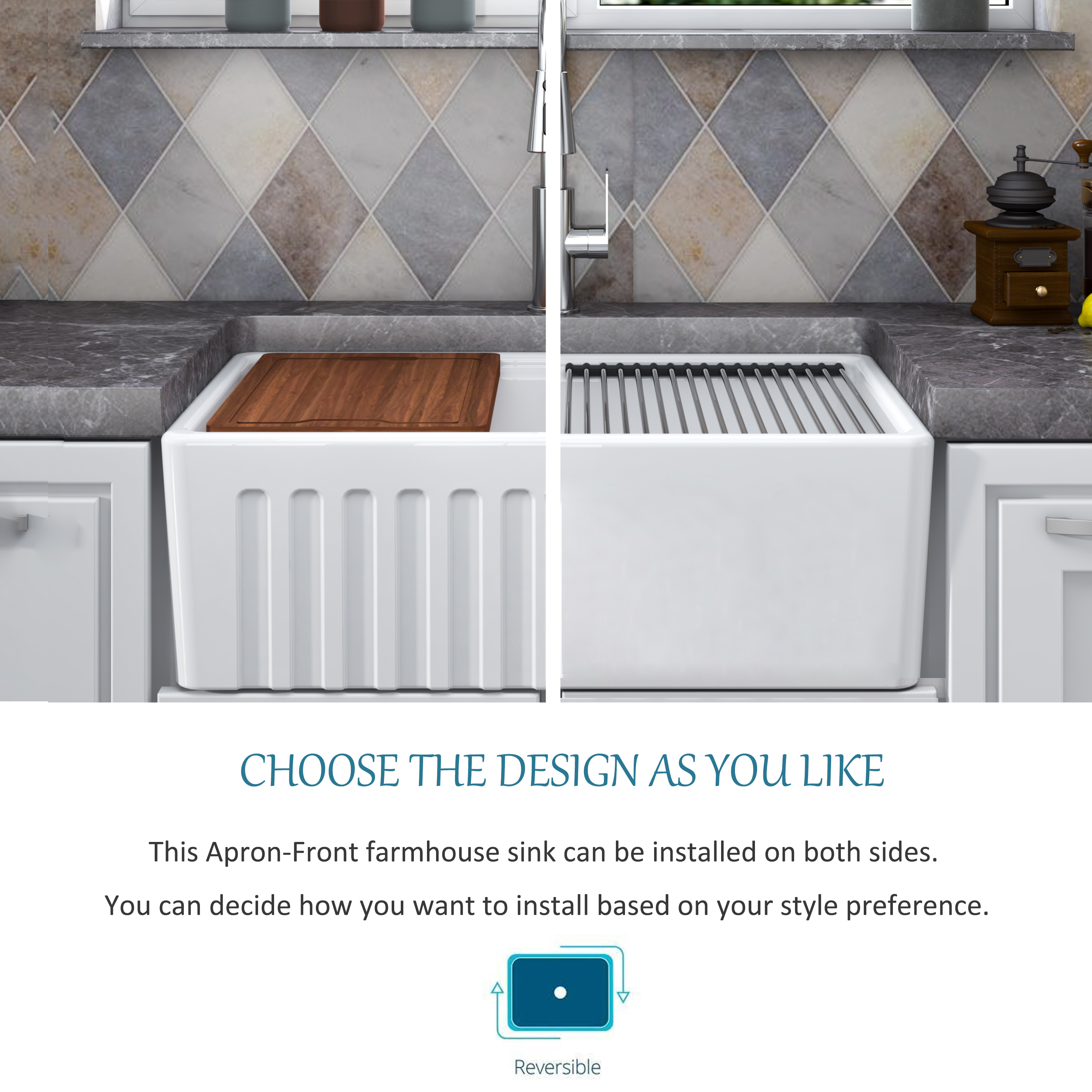 | This white farmhouse kitchen sink is made of real fire-resistant clay, a special white clay that is fired at high temperature for extremely high strength and durability. | This Apron-Front farmhouse sink can be installed with either a traditional flat front or with a decorative band feature front ! ! ! You can decide which side pattern to install based on your style preference. | With high-quality glazing technology , the sink has a durable surface that can prevent Scratch and Staining from food and water minerals . |