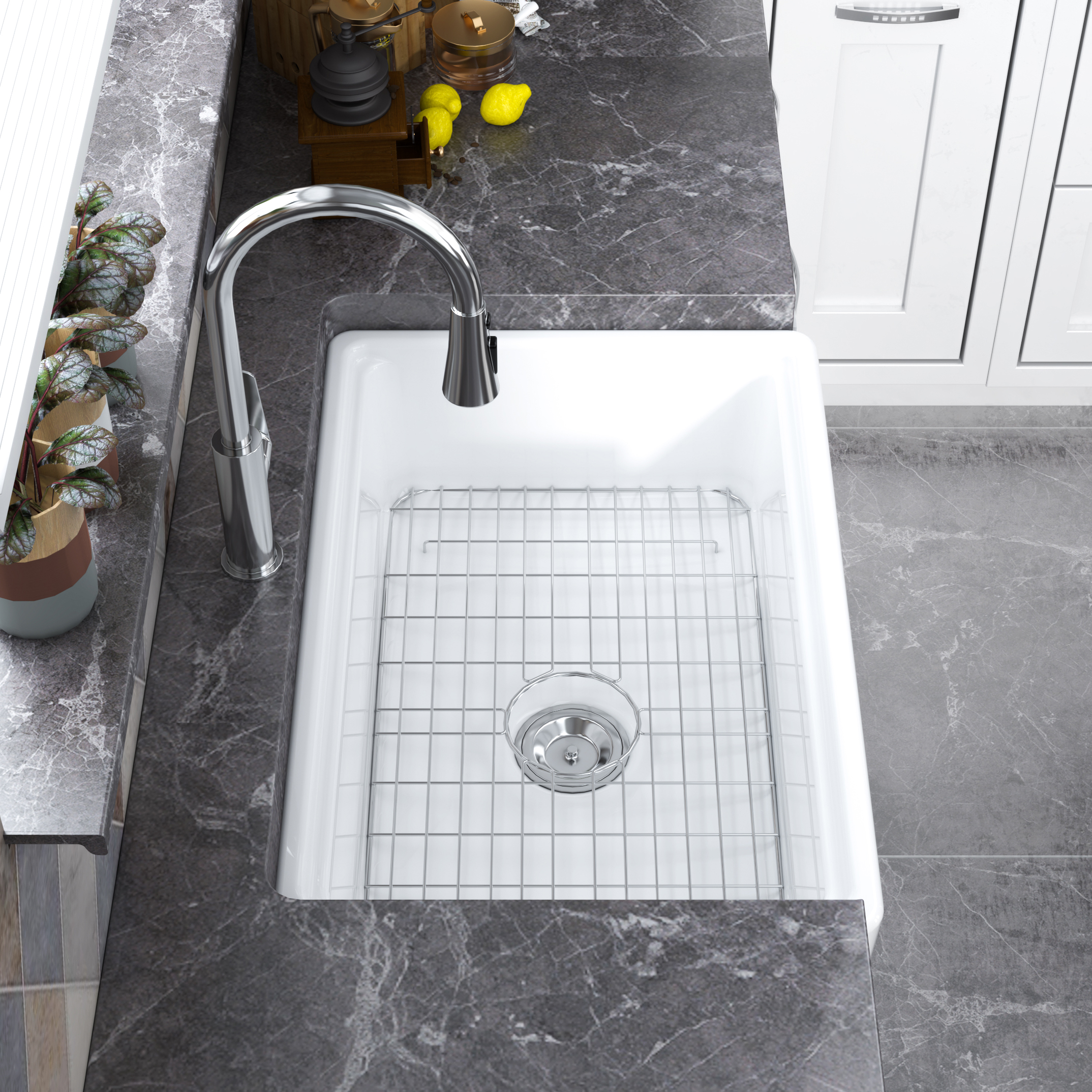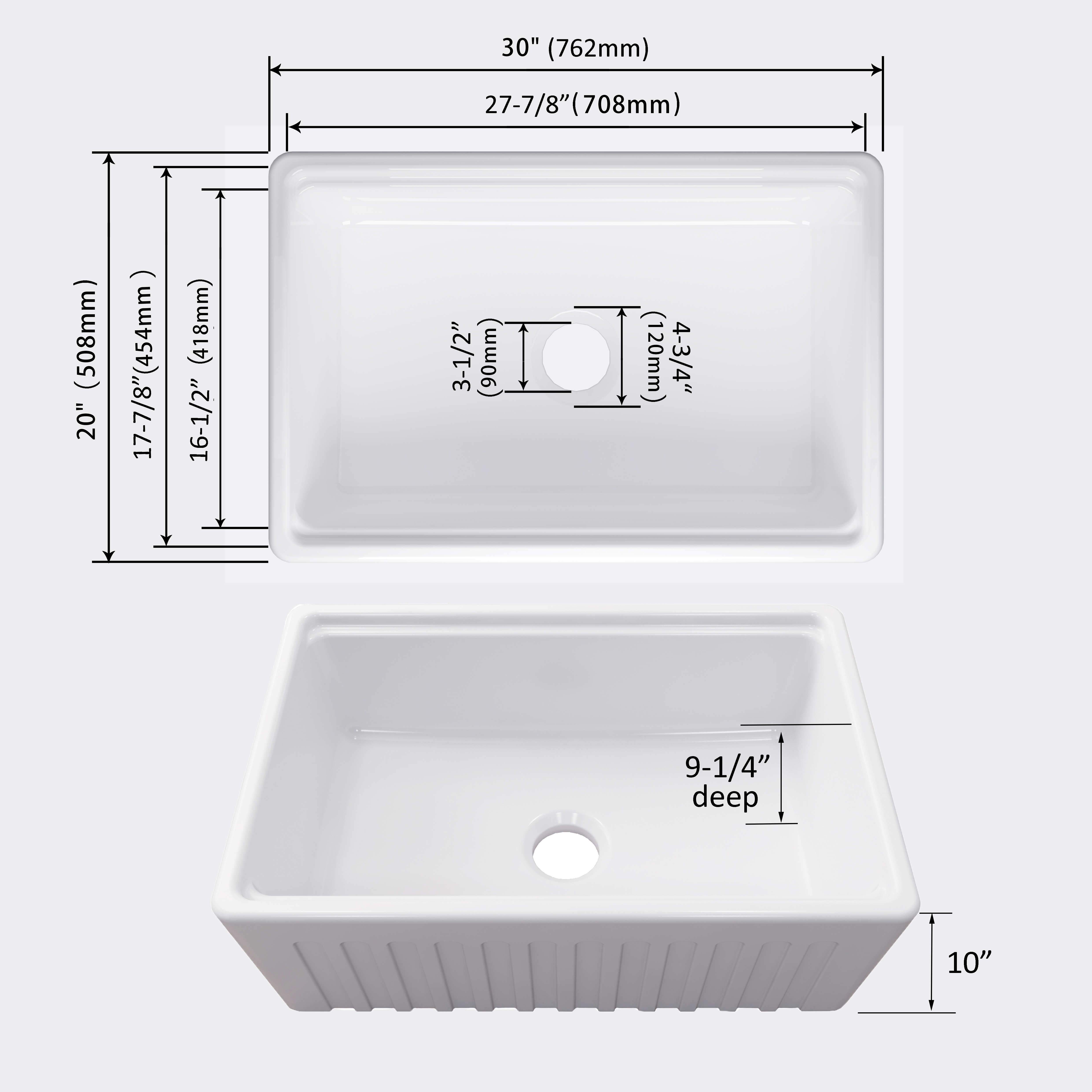 | 30"L x 20"W x 10"H (9-1/4" Depth ) - Large sink with straight sidewalls and tightly rounded corners create a generous workspace that accommodates large items like stock pots and baking sheets . | Stainless steel bottom grid with soft bumpers protects the bottom of your sink from scratches and dents, and elevates dishes for better draining. Stainless steel strainer keeps drainpipe free of debris . | Standard 3-1/2" drain opening , fast drain and prevent blockage. The super smooth white glazed finish is easy to clean and maintain. |
