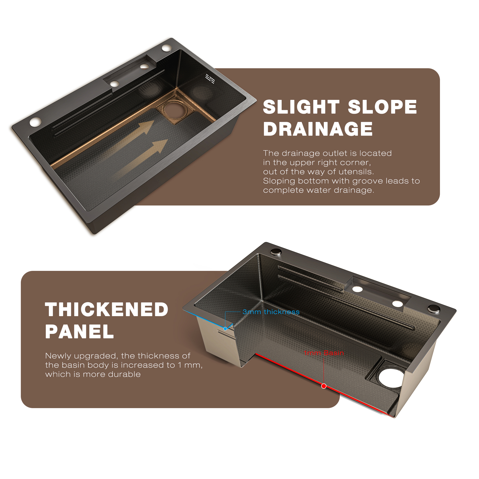 Five-fold Coating ProtectionThe sink is composed of five materials: nano-coating, black baking paint coating, high-temperature anticorrosion layer, acid and alkali anti-rust layer and high-quality stainless steel, which is heat-resistant, moisture-proof and easy to clean. | Upgrade Quality MaterialThis sink Upgrades the Thickness of the stainless steel panel of the sink body, making it stronger and able to withstand more kitchen utensils without deformation, excellent strength and durability, rust and dent resistance.