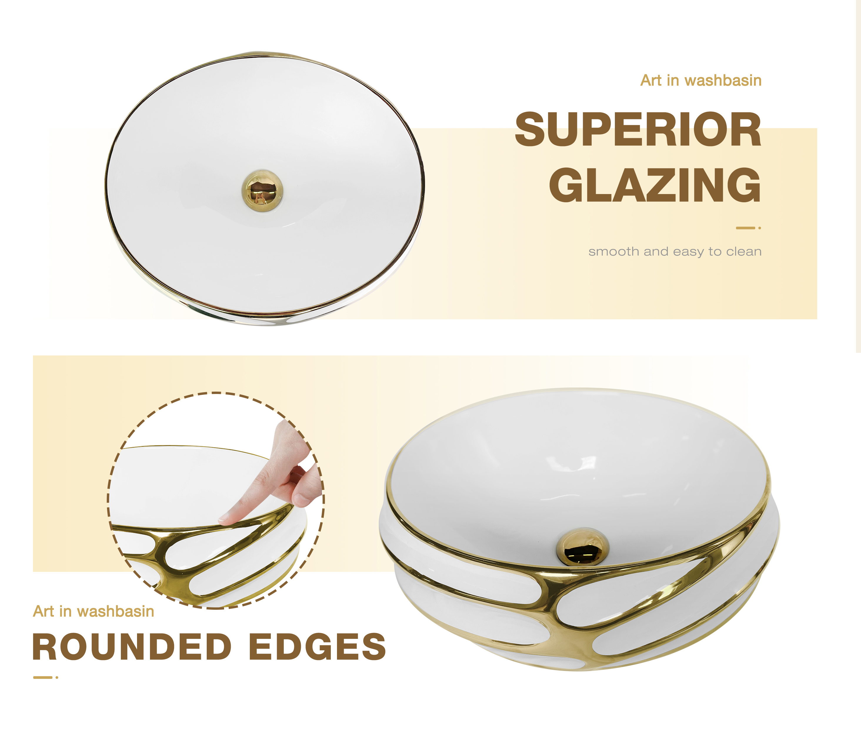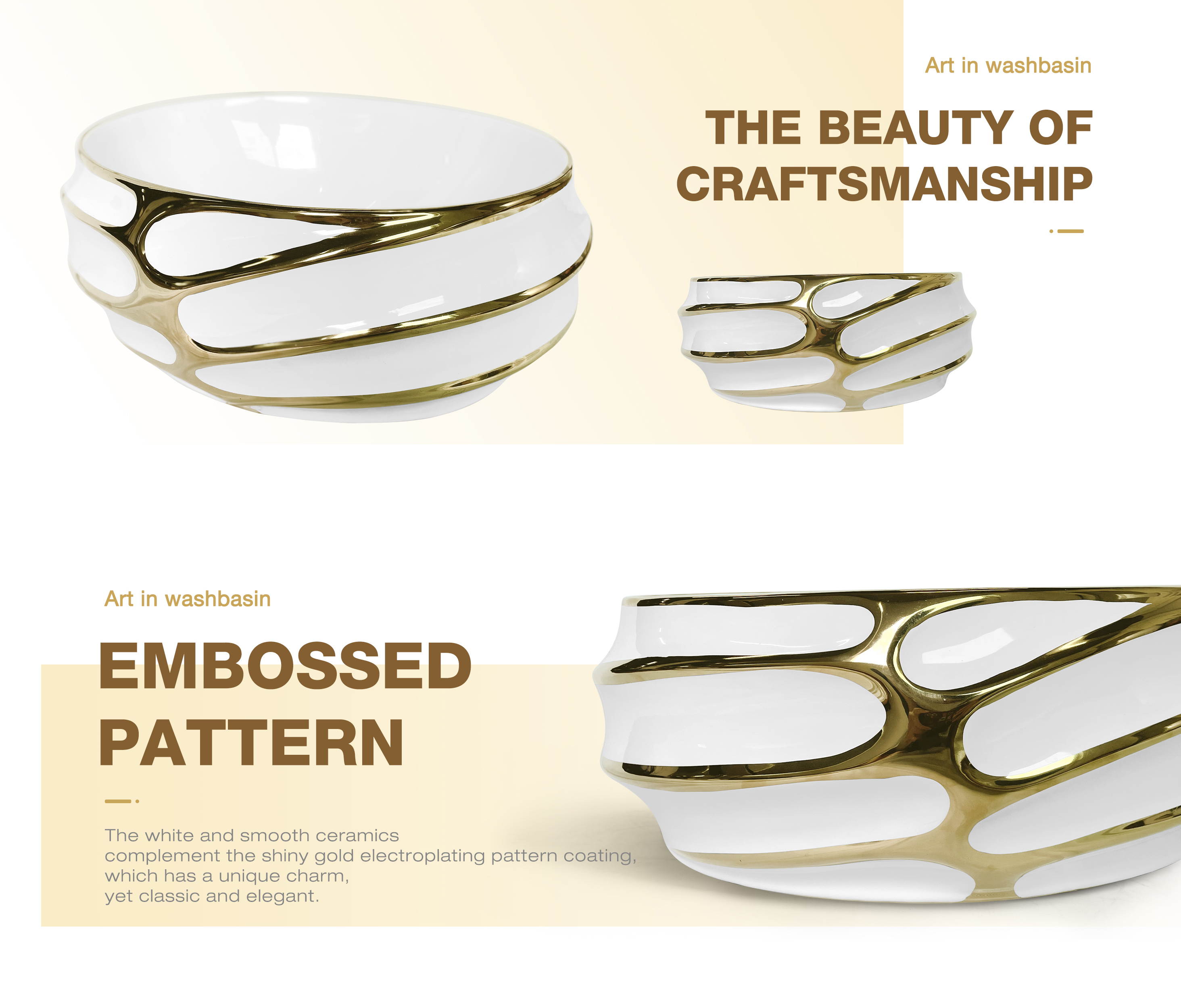 | The shiny gold art basin boasts a large capacity for your convenience.With this innovative design, water is not easily spitting out, making cleaning a breeze. | The ceramic sink with unique golden pattern is safe to use and can minimize injuries caused by accidental impact. The rounded eages give consideration to both safety and beauty. |